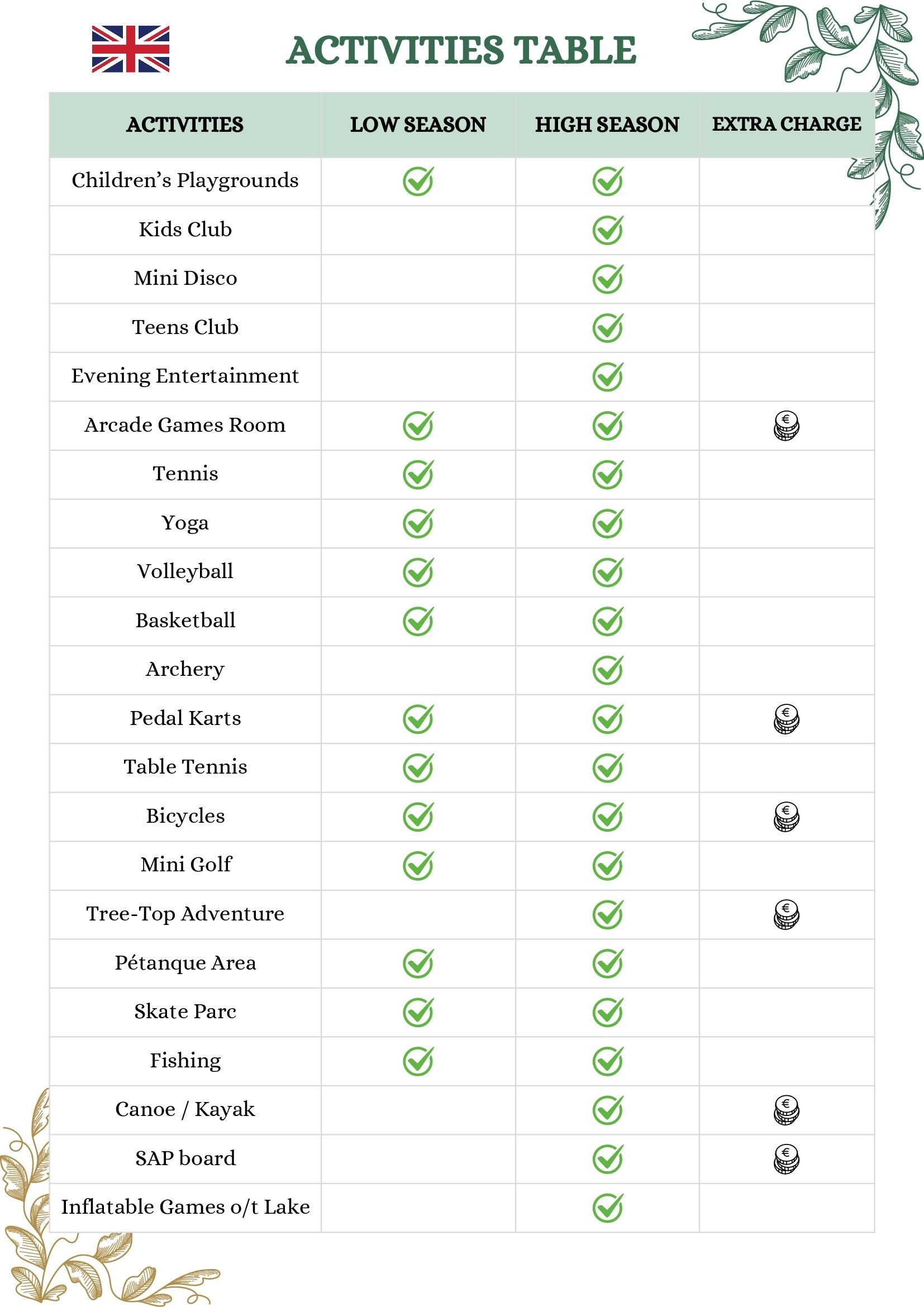Von Juni bis August bieten wir Ihnen eine große Auswahl an Animationen und Aktivitäten an 6 Tagen in der Woche. Genießen Sie die zahlreichen Einrichtungen, die Ihren Aufenthalt zu einem unvergesslichen Erlebnis machen werden.
