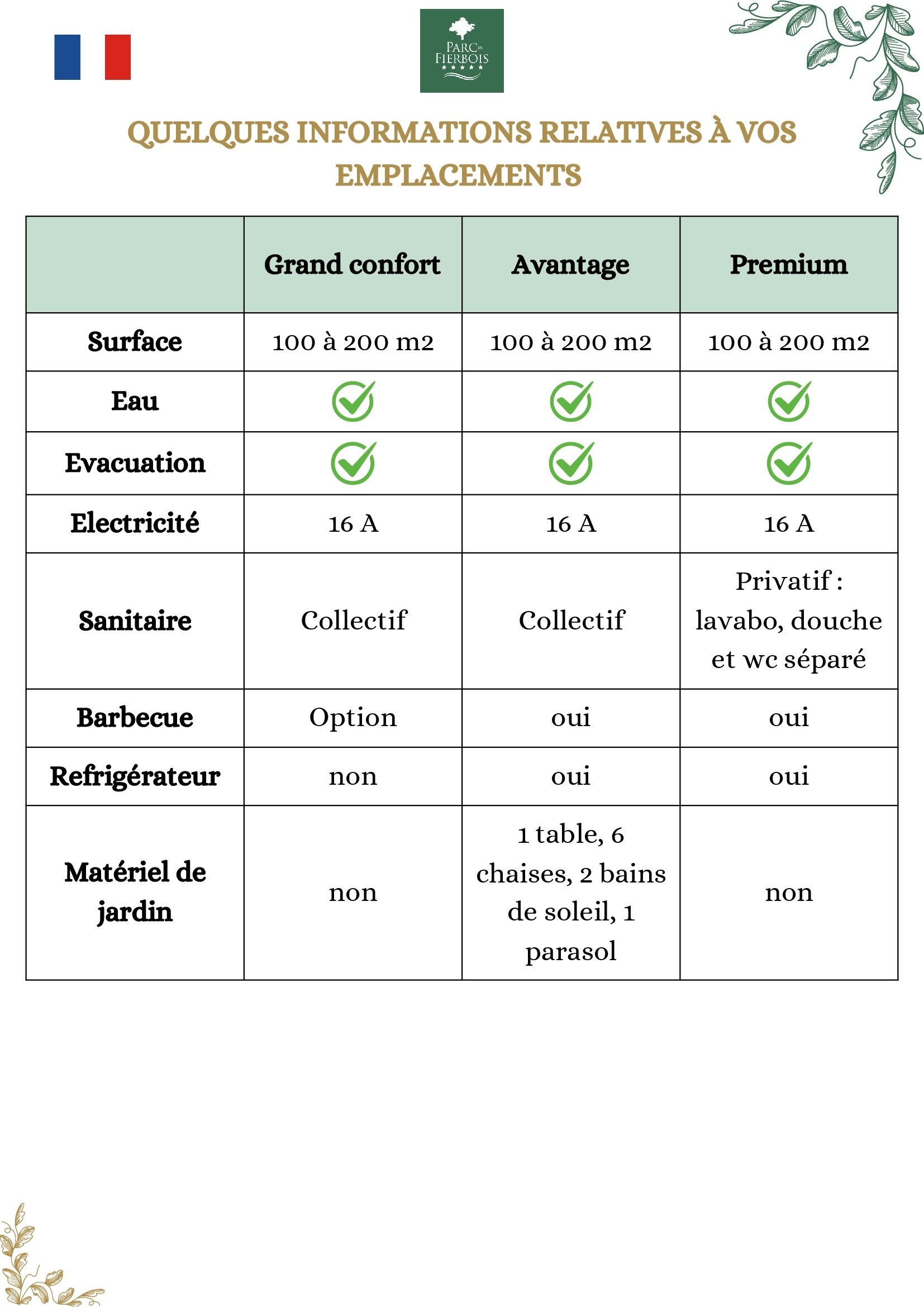 The Parc de Fierbois has created a range of pitches to suit all budgets. Their level of equipment varies according to the 3 comfort ranges on offer: Grand Confort – Avantage – Premium.